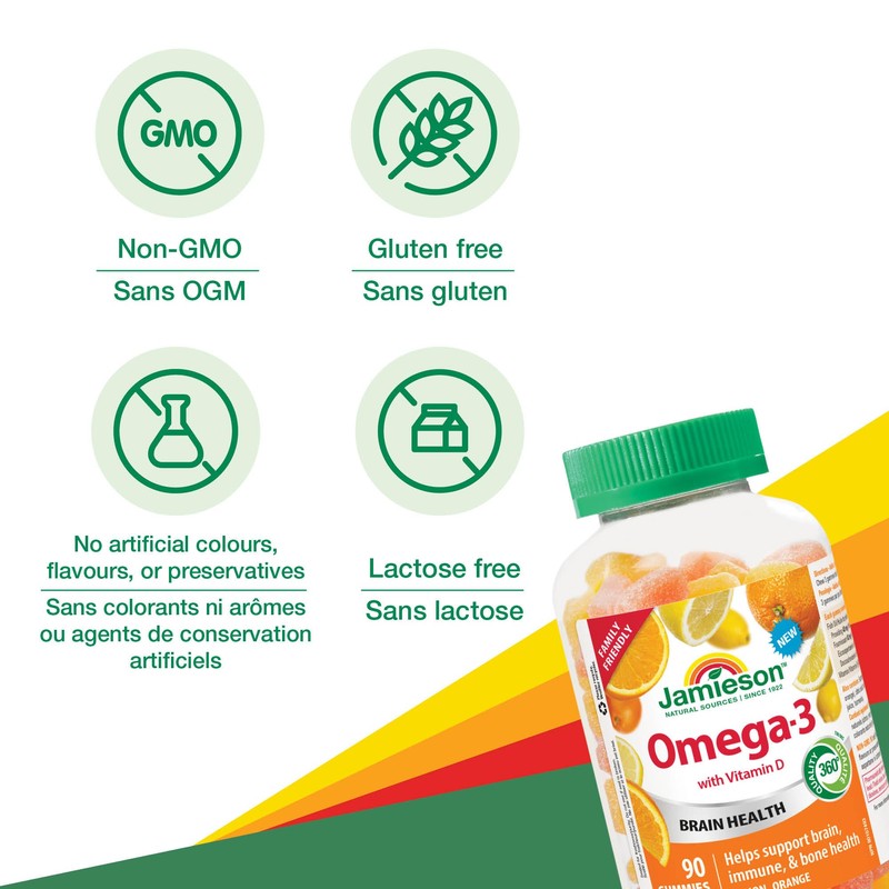Jamieson Omega-3 Gummies are a family-friendly formula providing premium EPA and DHA plus Vitamin D3 in all-natural orange, lemon & mixed berry flavor gummies. The family-friendly formula is for adults, adolescents, and children 3 years and older. Jamieson Omega-3 Gummies are free from artificial flavors, colors, or preservatives.