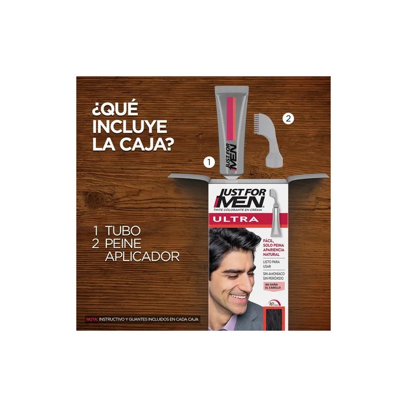 La fórmula de Just For Men Ultra está diseñada para recuperar tu color natural, dando como resultado un tono uniforme y sin manchas. Es fácil de aplicar y no requiere de complicados procesos, por lo que podrás lograr el resultado que deseas desde la comodidad de tu hogar.