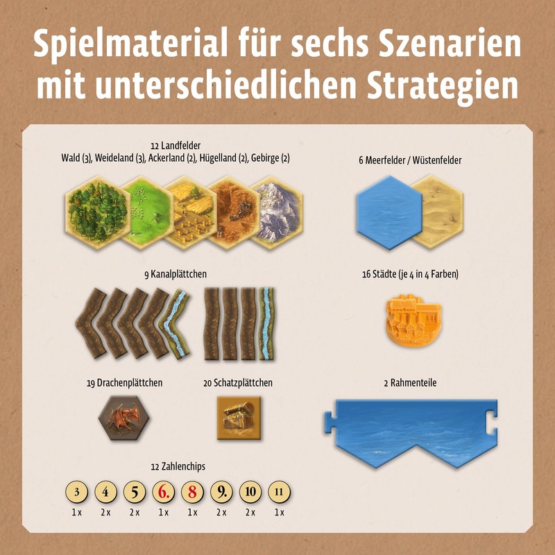 - Scenarios with varying levels of difficulty for experienced CATAN fans.