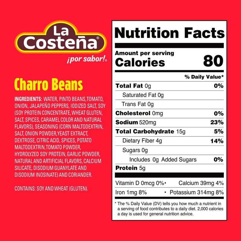 La Costeña Charro Beans - Ready-to-Eat Canned Pinto Beans with Chorizo, Bacon & Chicharrones - Mexican Food, Tex Mex, Chili Ingredients, Bean Dip, Bean Burger & Burrito - 19.75oz, 12 Pack Canned Food