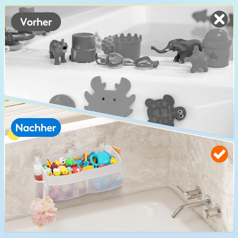 • Sturdy material: this bath toy storage for the bath is made of tear-resistant polyester fabric, ensuring quick drying and excellent breathability for your bath toys. The included adhesive hooks are not only waterproof, but also very good adhesion