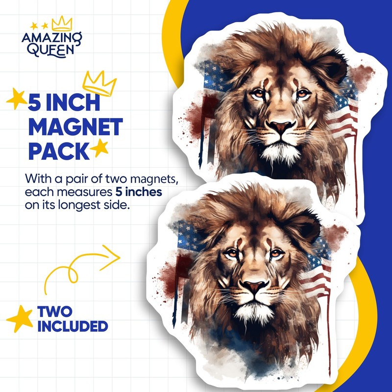 Each pack comes with two identical magnets featuring the same design not an assorted designs. Elevate your space with these striking magnets showcasing a majestic lion portrait overlaid with the iconic American flag. Infuse your home with a touch of patriotic flair and artistic expression. These magnets serve as versatile accents on refrigerators, lockers, whiteboards, and beyond. Add a touch of national pride to any magnetic surface. The quality design ensures visual appeal, making it a standout piece of art for everyday display.