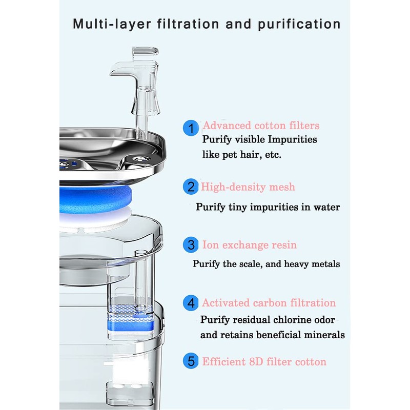- 【Three filtrations of pure water】 The pet water fountain uses a good filtration system. Filter contains three levels of filtration: cotton, activated carbon, and ion exchange resin, and is equipped with an 8D filter and pre-filter sponge to effectively filter pet hair and dirt, providing pure water. Let dogs and cats drink healthy water without a dark chin.