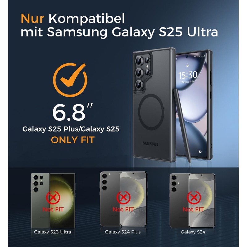 - [Super Magnetic Adsorption] Its magnetic strength has been greatly improved, never shaken off even violent swings. Designed for Samsung Galaxy S25 Ultra. It is compatible with most MagSafe accessories such as wireless charger, magnetic car mount, magnetic wallet and so on. The perfectly aligned magnetic attraction makes wireless charging faster and more stable