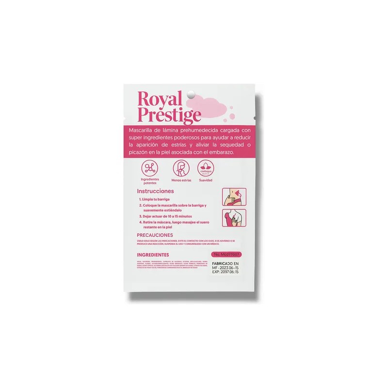 -Retira la mascarilla del sobre, despega con cuidado la malla de soporte de la mascarilla y aplica la mascarilla sobre tu pancita limpia y seca.