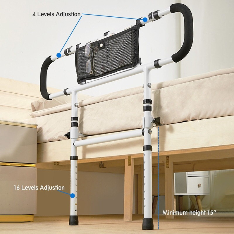 **Design upgrade:** This bed rail has an upgraded design, using dual handles and an non-slip design, providing you with a solid grip and enhanced stability. Added detachable storage bag, you can keep reading glasses, books, phone, remote control within easy reach.