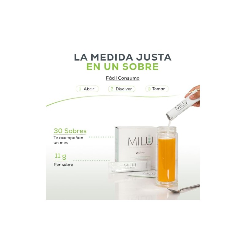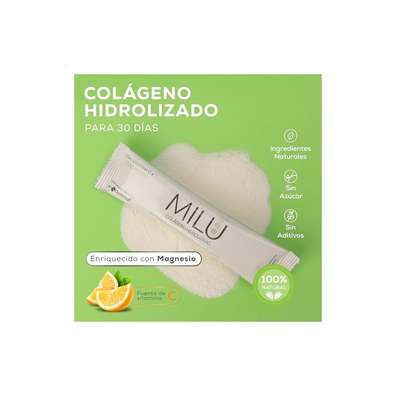 MILU | Colágeno Hidrolizado con Magnesio y Vitamina C | 30 Sobres individuales de 11g (1Caja) | Suplemento Alimenticio Sin Saborizantes - Sin Olor - Sin Azúcar | Péptidos de Colágeno Porcino | Apto para dietas Keto |