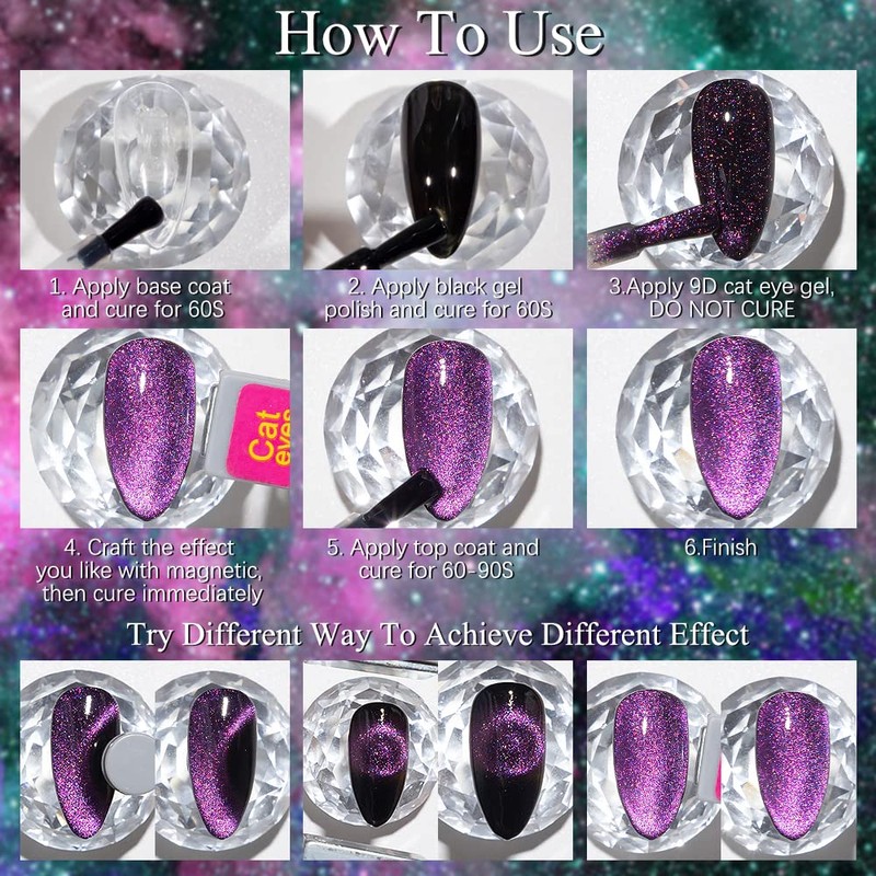 - ❤Galaxy Gel Collection Gift Set:5*10ml 9D Galaxy Cat Eye Nail Gel Polish, 1*Black Nail Gel, 1*Double Headed 3D Magnetic Stick, 1* Simple Magnetic Stick. All in one kit, save your money and time to salon!