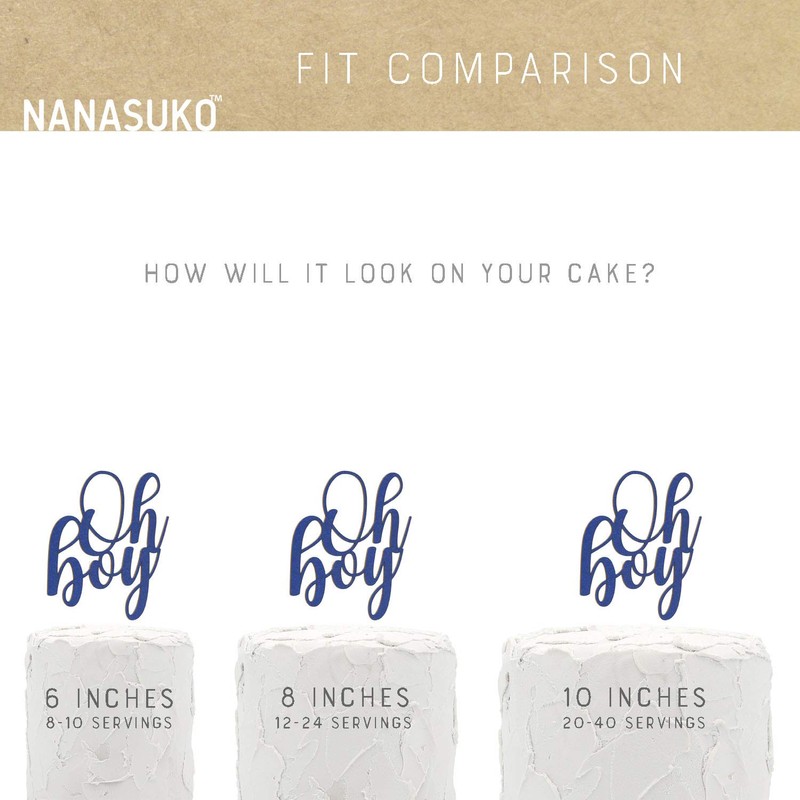 Oh boy' cake topper in whimsical cursive lettering design. It is made with high quality glitter permanently laminated on BOTH SIDES of a thick paperboard. The laminated board is then laser-cut, so there is no overlapping among the layers of materials. This gives our cake topper the desirable quality, thickness, and durability while still being affordable. Our cake topper can be used multiple times for photo shoots and the baby shower party itself by simply wash the food-safe clear acrylic stick (the design itself is NOT waterproof). The second image shows how the cake topper would look comparing to a 6 inch round cake. It will look nice for up to 10" cake. An acrylic stick is 5/32" diameter, 6" long which will give a flexibility of adjusting the level of the topper. It is attached on the back of the design. Furthermore, the acrylic stick is very clear so it will not provide any distraction on your cake decorations.
