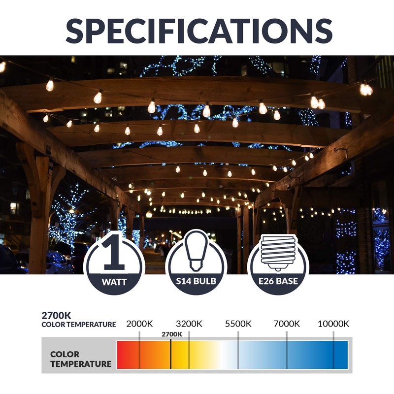 Newhouse Lighting S14LED30P Outdoor Weatherproof 1W (11W Equivalent) Shatter-Resistant S14 LED Replacement String Light Bulbs, Warm White 2700K, Standard E26 Base, 30-Pack, Shatterproof, 30 Count