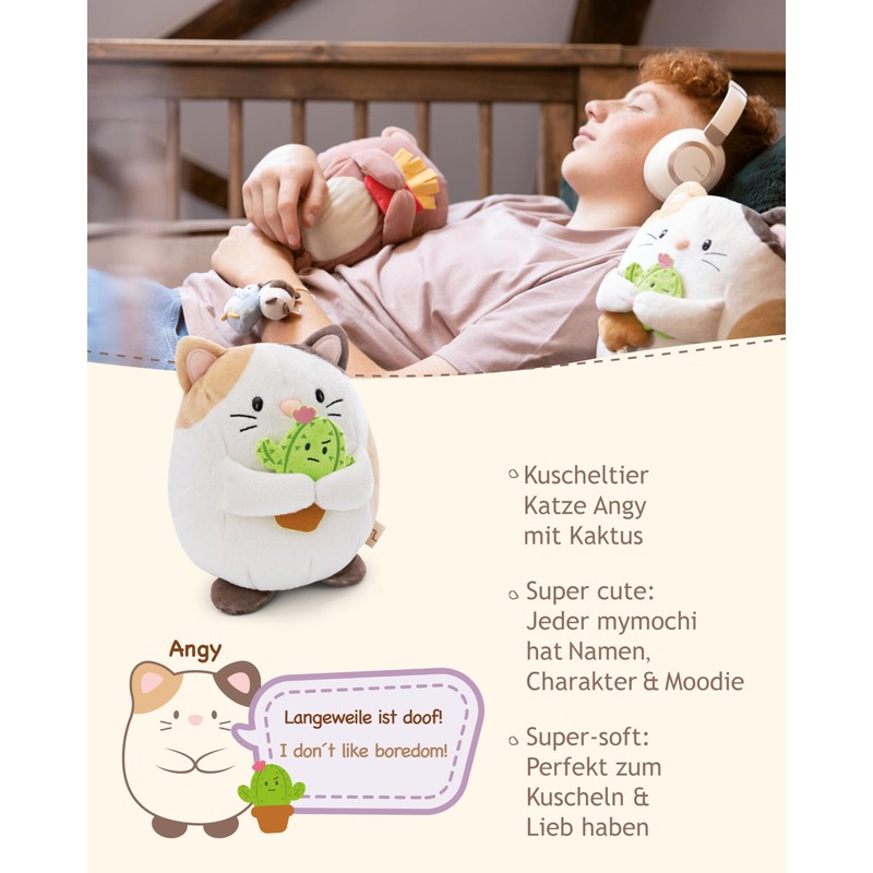 - MYMOCHI ANGY: Hello, I'm cuddly cat Angy and find boredom doof! The three-coloured lucky cat made of fluffy Nici plush has a super soft filling. As a moodie, Angy brings a cactus with you