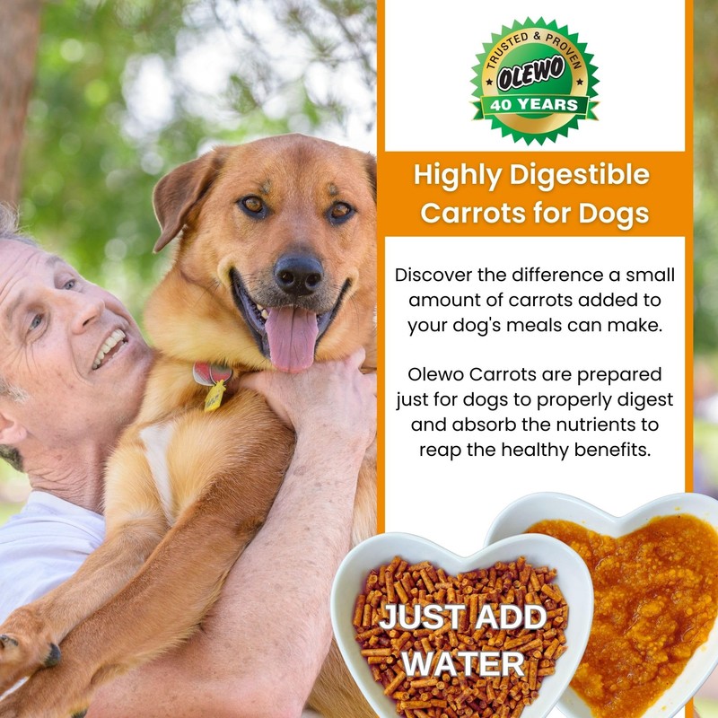 - DIGESTIVE SUPPORT: Our carrots provide natural dog digestive support from dog diarrhea, dog constipation relief to dog gas relief. Our carrots are high in beneficial, cleansing fiber and are one of the best meal mixers for dogs you will find in dog health supplies for no scoot for dogs. Containing all the necessary dog food supplements to soothe all kinds of tummy troubles, Olewo carrots for dogs provide all-natural dog upset stomach relief for changes in diet, dietary indiscretion, stress.