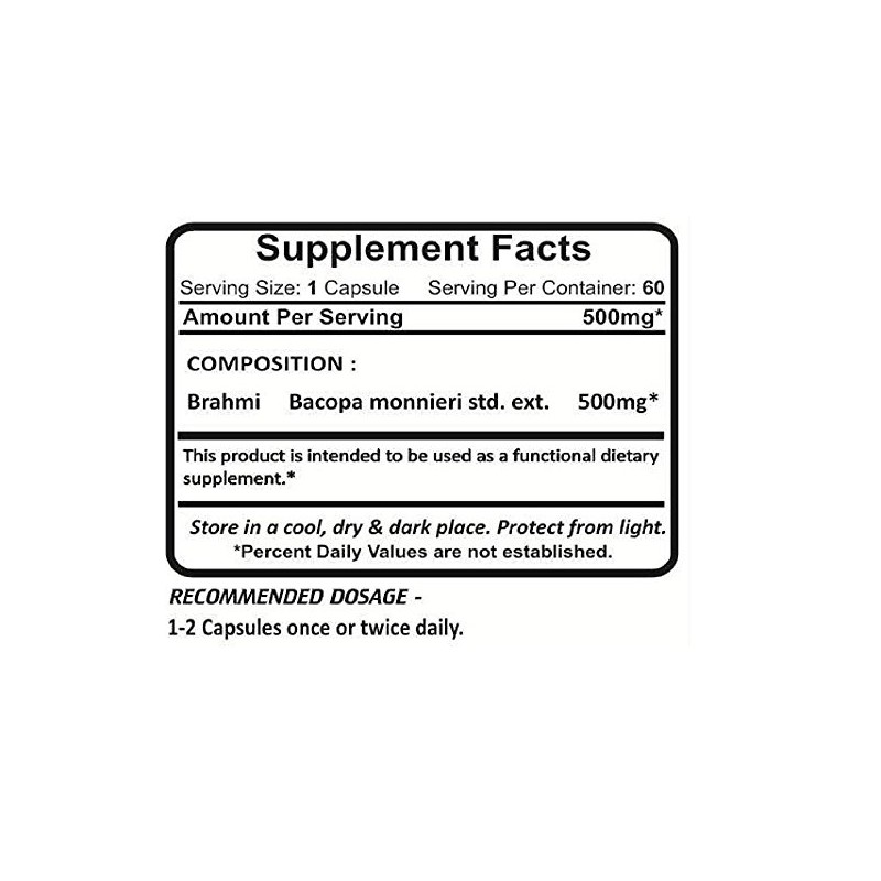Brahmi Capsules are 100 % vegetarian and natural. It contain Bacopa monneiri in extract form. INGREDIENTS: Each capsule contains 500mg standardized extract of Herb - Brahmi (Bacopa monnieri).