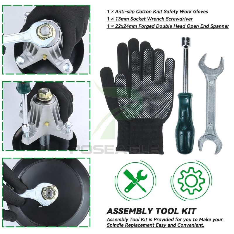 - ADDED VALUE: Assembly Tool Kit is Provided for you to Make your Spindle Assembly Kit Replacement Easiler and more Convenient. Assembly Tool Kit Includes: 1x 22mm x24mm Forged Double Head Open End Spanner+ 1x 13mm Socket Wrench Screwdriver+ 1x Anti-slip Cotton Knit Safety Work Gloves