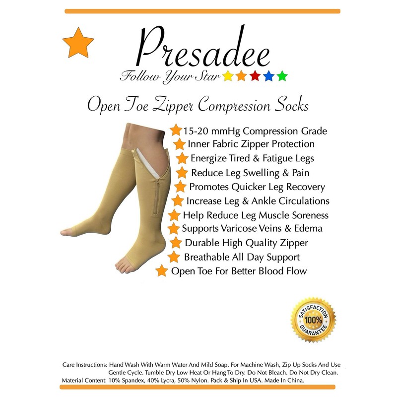 Presadee Open Toe 15-20 mmHg Moderate Compression Leg Calf Swelling Zipper Sock (Beige, L/XL)
