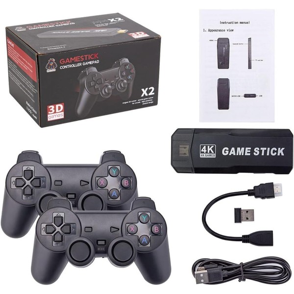- 【Package Contains】1 X Game Stick, 2 X Wireless Game Console, 1 X HD Extension Cable, 1 X USB Cable, 1 X Receiver, 1 X TF Card, 1 X User Manual.