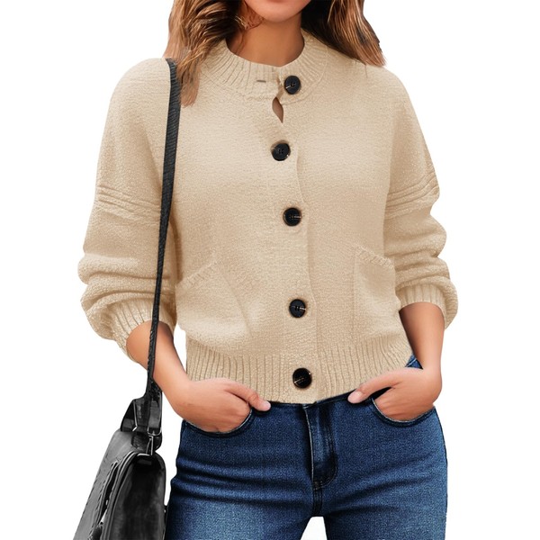 Saodimallsu Womens Button Up Cardigans Fall Crew Neck Fuzzy Knit Long Sleeve Cropped Sweater Jacket with Pockets Apricot