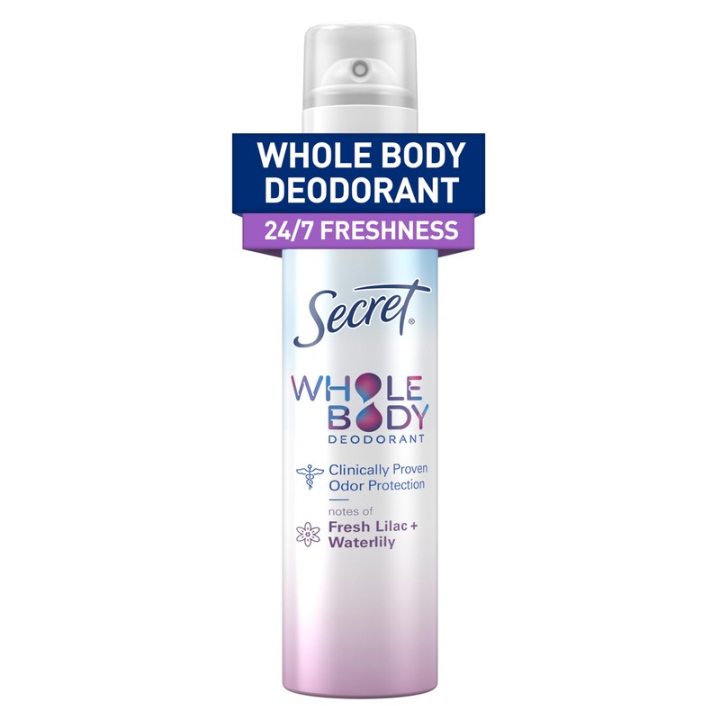 - Secret Whole Body Deodorant Spray for Women, Lilac & Waterlily Scent, Aluminum Free Deodorant Spray, 72 HR Odor Protection, 3.5 oz
