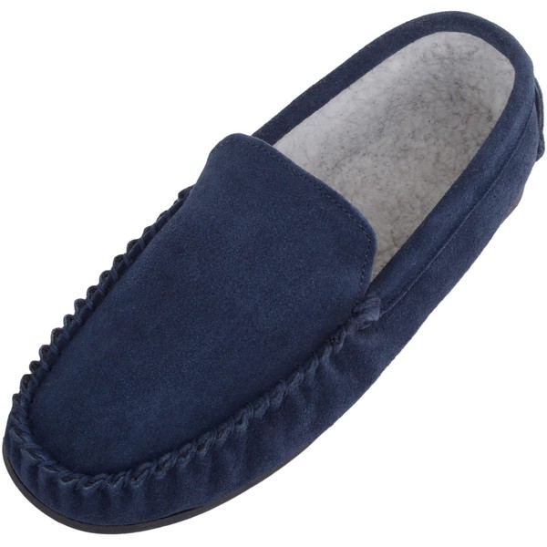 SNUGRUGS Mens Berber Fleece Lined Moccasin Slipper with Non-Slip Rubber Sole - Navy - UK 8