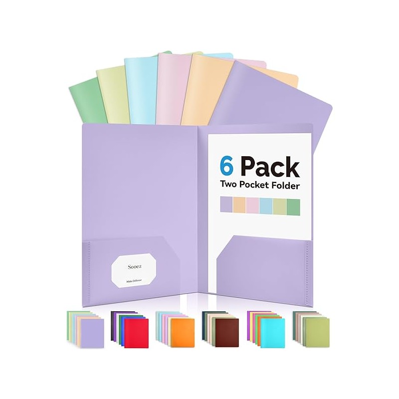 Sooez 6Pack Folders with Pockets, Pastel Colors, Heavy Duty Plastic Folders, 2 Pocket File Folders, School & Office Filing Supplies