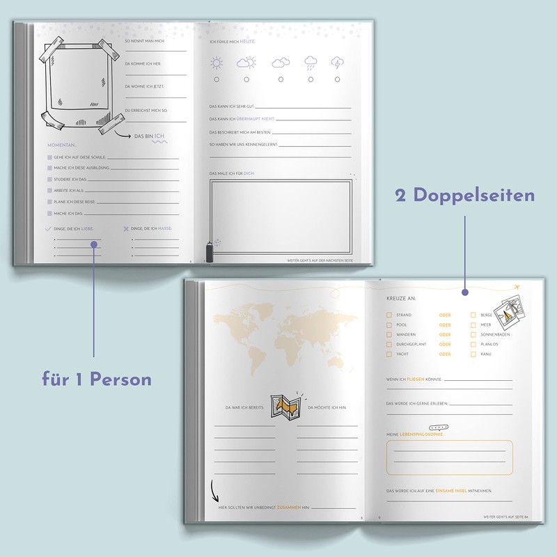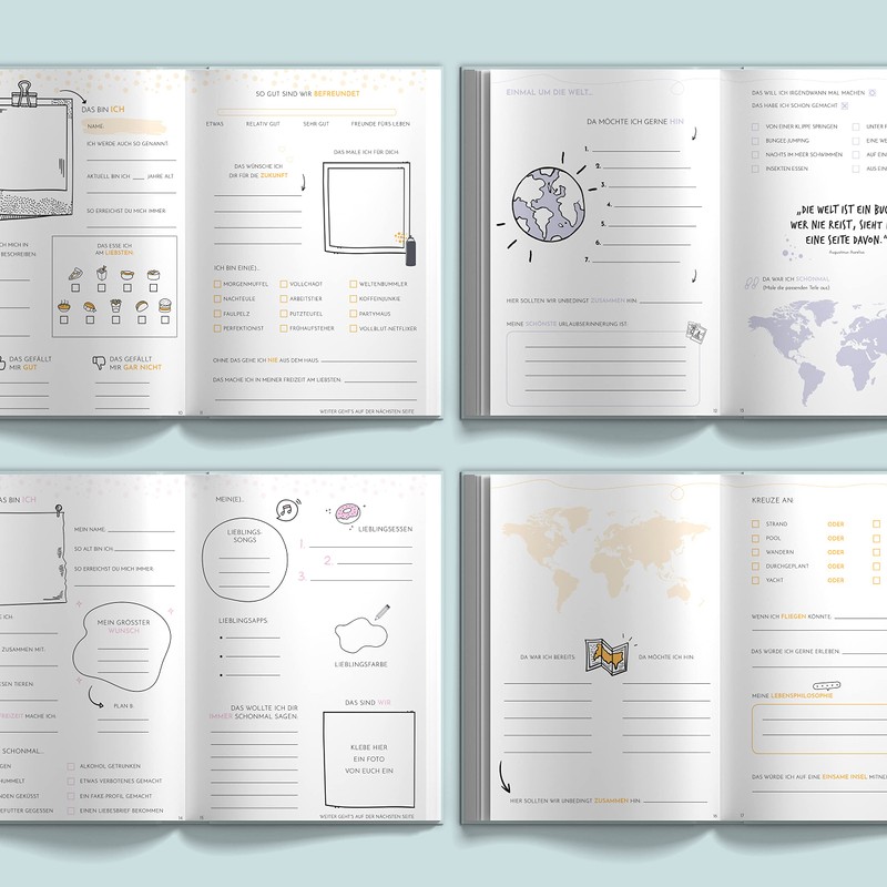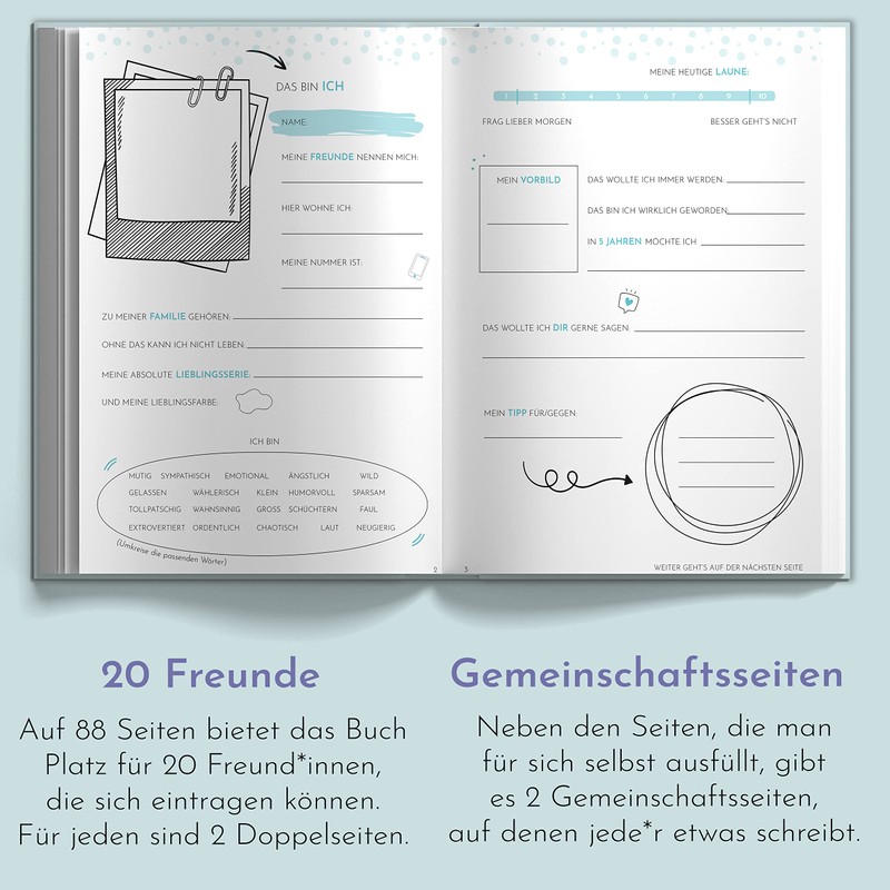 Get to know your friends even better and keep memories forever. The popular friendship book is back! On a total of 88 pages, 20 of your friends can be immortalised on 2 double sides! Do you prefer to go to the beach or the mountains? What is the greatest wish of your friends? With 4 different designs to write in, it is guaranteed never to be boring. There is also an extra double side for everyone alongside the classic side, which guarantees something new about the person. On 3 community pages, your friends can get together again and live out creatively! With the handy A5 format you can easily give it to your friends.