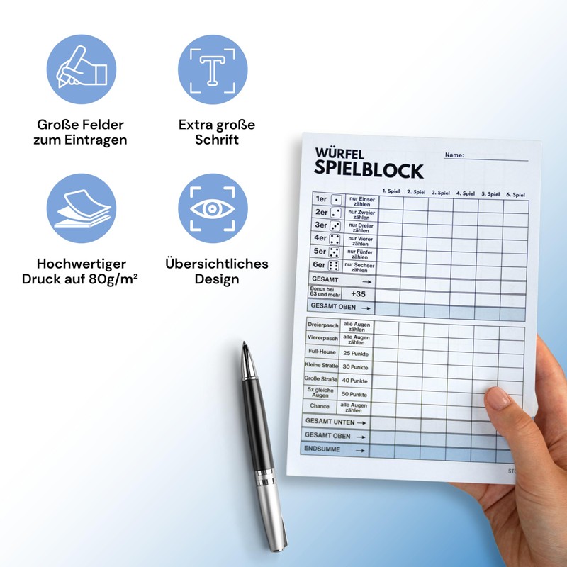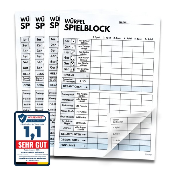 STOKU 4 x Dice Game Pad DIN A5 - Printed on Both Scores - Extra Large Writing for Seniors and Children - Set of 4 - 60 Sheets Each