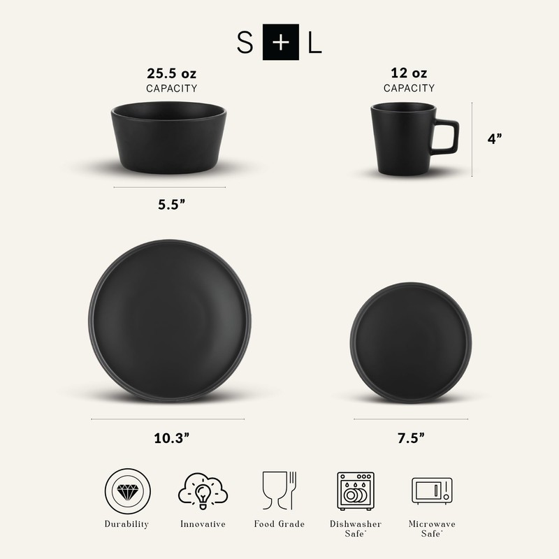 - Black Matte Plates, Bowls, Mugs - 10.25” dinner plates, 7.5” salad plates, 5.63” bowls and 12 oz. mugs have a cool, hip, ebony design.