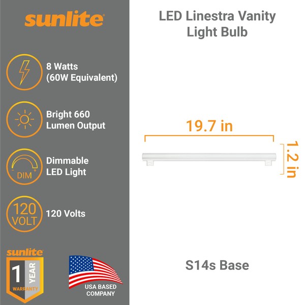 Sunlite 53150-SU LED Linestra Vanity Light Bulb LN60 Replacement Lightbulb, 19.5 Inches, 8 Watt (60W Equivalent), Dimmable, S14s Base, 660 Lumens, 1 Count, 2700K Warm White