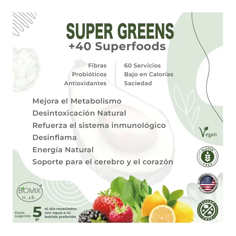 💚🌿 ¡Poder verde en cada cucharada! Este Super Greens en polvo combina más de 40 superfoods, junto con probióticos, enzimas digestivas, antioxidantes y fibra, para un impulso total a tu salud 🌱🔥. Ideal para preparar malteadas detox 🥤, sin azúcar ni gluten, que nutren desde el interior y desintoxican de forma natural 💪🧘♀️. ¡Energía, digestión, inmunidad y bienestar en un solo scoop! 🍃✨🌈