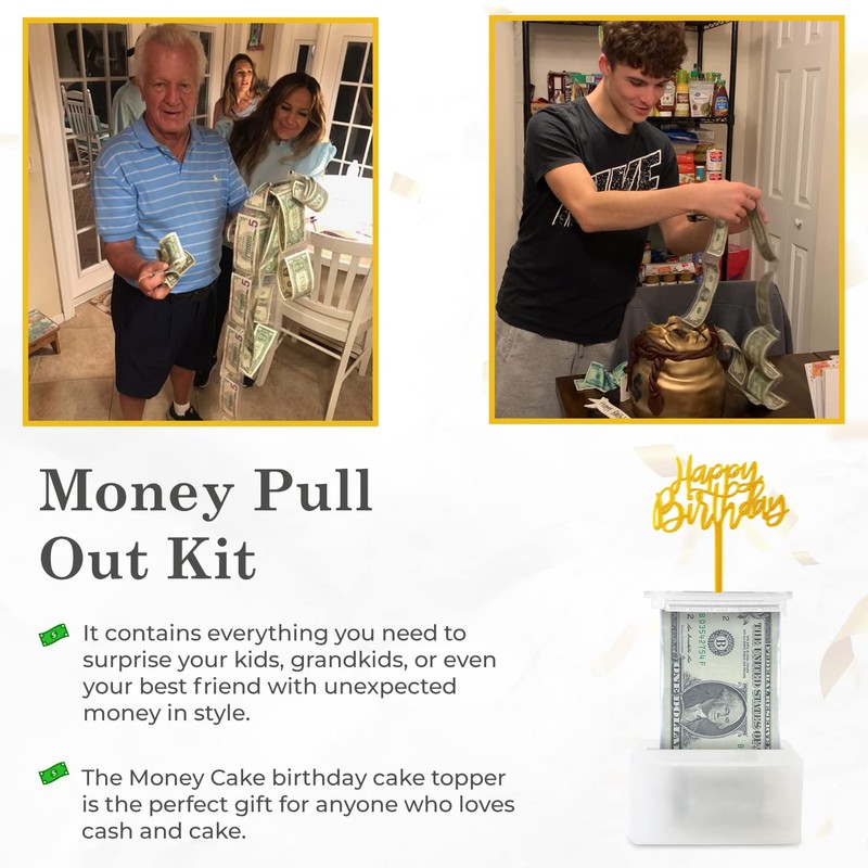 - Money Surprise Box: Bring joy to someone's special day with our cake money pull out kit! It is perfect for anyone who loves cash and cake. Moreover, the kit contains everything you need to surprise your kids, grandkids, or best friend in style.