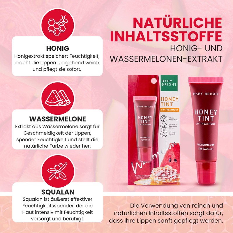 - Advanced moisture supply and care: our honey lip tint from Baby Bright is more than just a lip balm. Honey extract treatments moisturise, nourish the lips and make them soft, supple and healthy. Ideal for people who want long-lasting moisture and care.