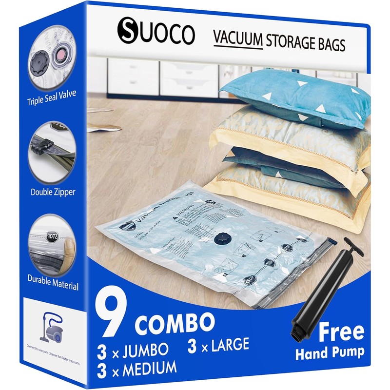 - Packaging details: 3 jumbo bags (100 x 70 cm), 3 large bags (80 x 60 cm) and 3 medium bags (70 x 50 cm) with hand pump. Ideal for versatile use at home and on the go.