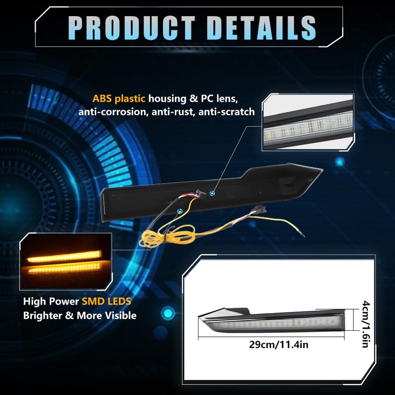 - [Effortless Installation] Upgrade your vehicle easily with no drilling required. Replacing the original OEM Bumper Trim, it goes beyond by incorporating LED Daytime Running Lights that also serve as Amber Sequential Turn Signals. Installation is straight forward—connect the black wire to the negative (-), the white wire to High Beam (Low Light) (+), the red wire to DRL / ACC (+), and the yellow wire to the signal light (+).