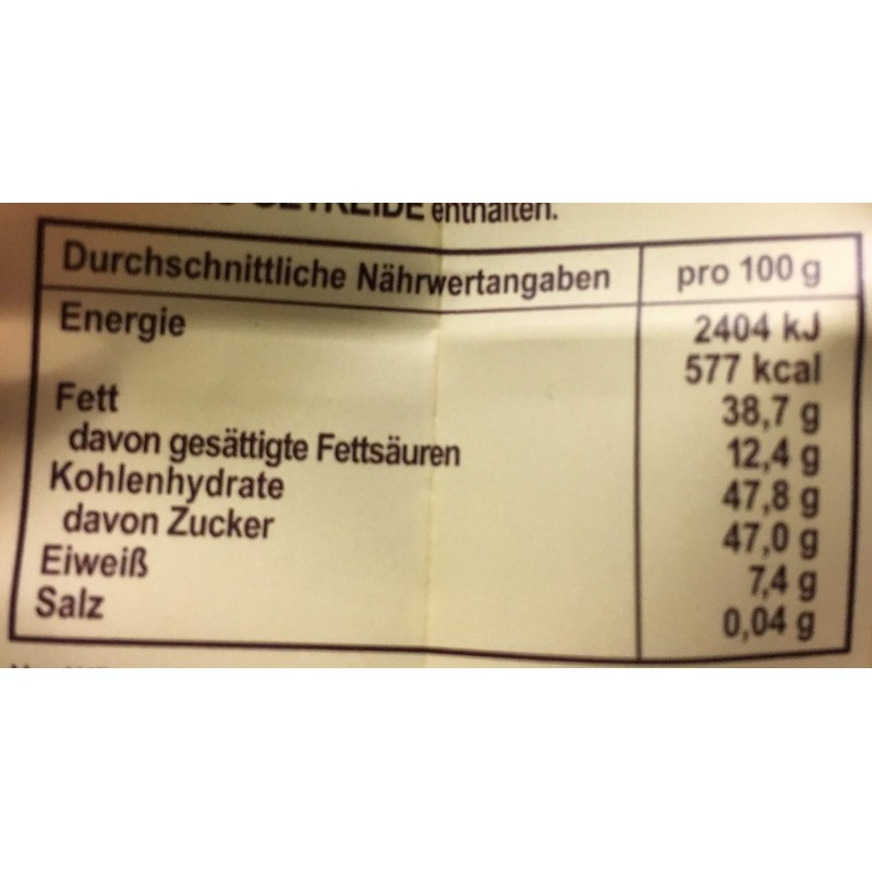 - Ingredients: sugar, roasted hazelnuts (34%), cocoa butter, whole milk powder, cocoa mass, emulsifier: soy lecithin bourbon vanilla. Nutritional values per calorific value: 579.00 kcal/2,408.00 kJ fat: 38.90 fat, of which saturated fatty acids: 12.40 carbohydrates: 47.70 carbohydrates, of which sugar: 46.70 protein: 7.40 salt: 0.05