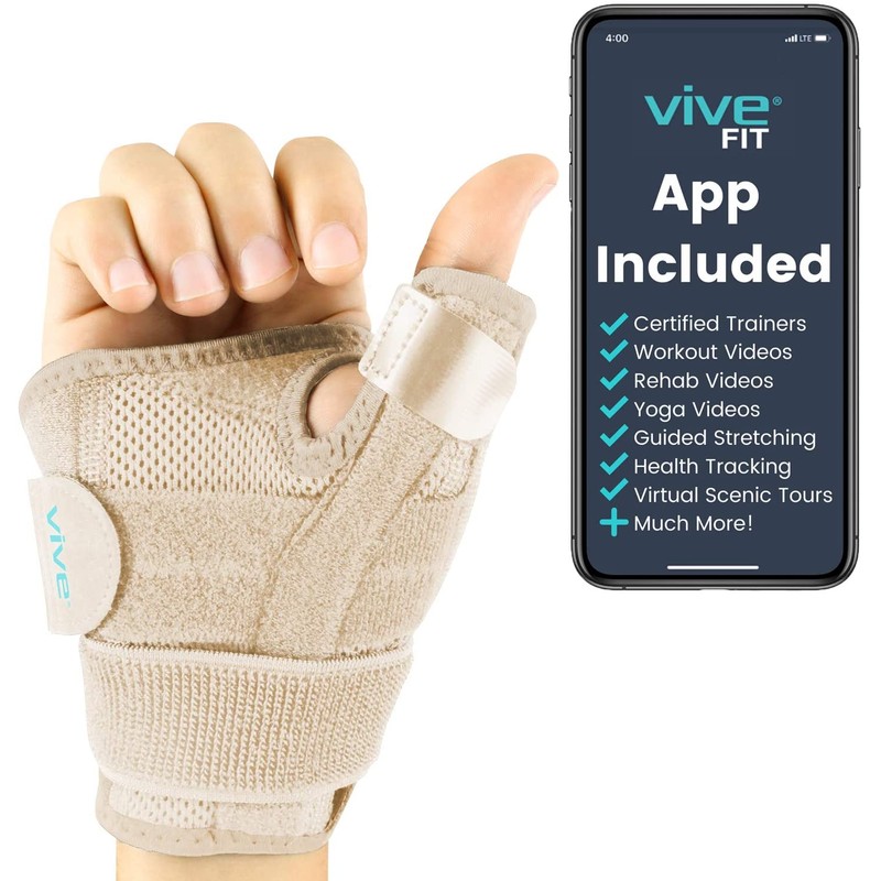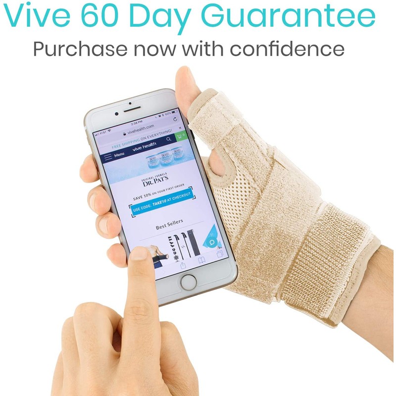 - STABLE SUPPORT FOR THUMB: Supporting the thumb joints and ligaments, the Vive thumb brace restricts the movement of the thumb while supplying adjustable compression and retaining therapeutic heat to improve circulation and promote healing. The lightweight brace allows the full use of the remaining fingers so you can complete daily tasks with ease.