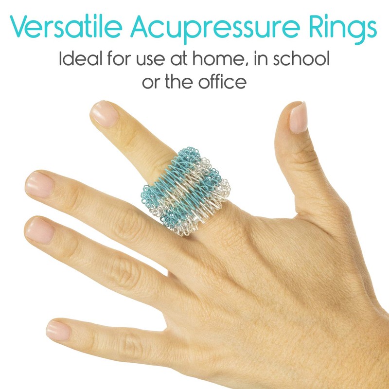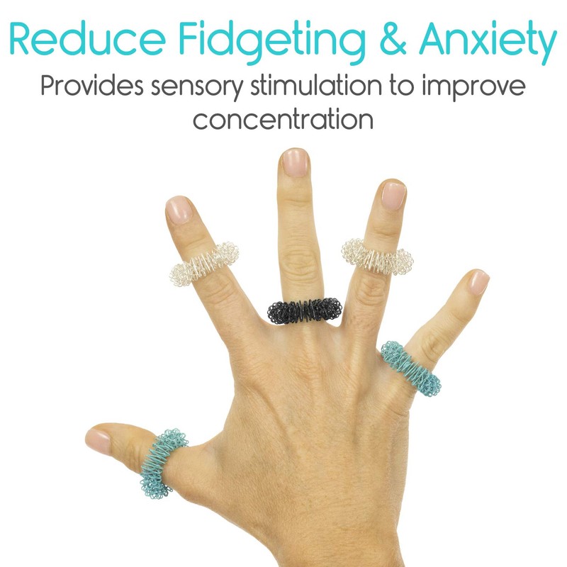 - REDUCE FIDGETING, STRESS AND ANXIETY: Providing sensory and tactile stimulation, Vive sensory rings reduce anxiety, stress and fidgeting while improving focus and concentration. Perfect for older youths, teens and adults, the sensory rings produce gentle acupressure when rolled back and forth along the fingers to calm the senses.