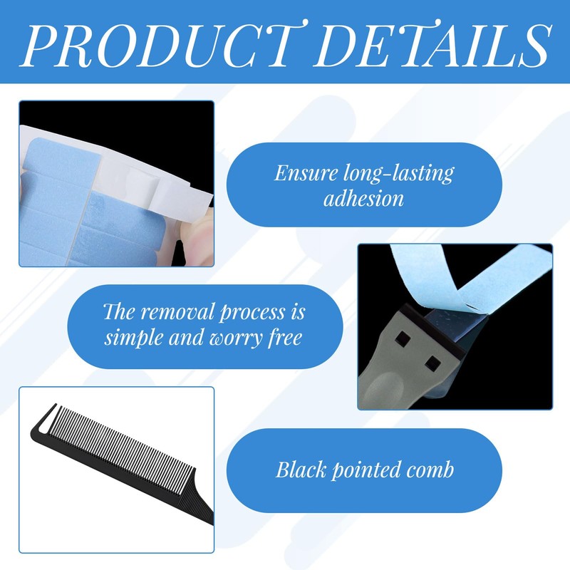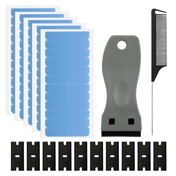 Colour: BlueSize: Please refer to the pictures for detailed dimensionsPackage Includes: 132Pcs hair extension kitsYou will get a complete set of hair extension kits, including 120 traceless hair extension tapes, 10 plastic blades, 1 scraper and 1 comb, which can help you blend the hair extensions seamlessly into your natural hair for a perfect hairstyle.Our tape hair extension strips are made of high-quality materials, sweat-proof and waterproof, ensuring long-lasting bonding, so you can rest assured even during intense physical activities or humid environments.This transparent hair extension tape can be perfectly invisible on your hair, no need to worry about visible attachments, ensuring your hair extensions look and feel natural, making your hair more perfect and full.Our tape extension tabs come with built-in spacers to prevent them from melting or sticking together, making the application and removal process simple and easy.Designed with double-sided super-strong adhesive, this hair extension tape sticks firmly to your hair, ensuring your hair extensions stay in place and won't fall out even during intense activities.