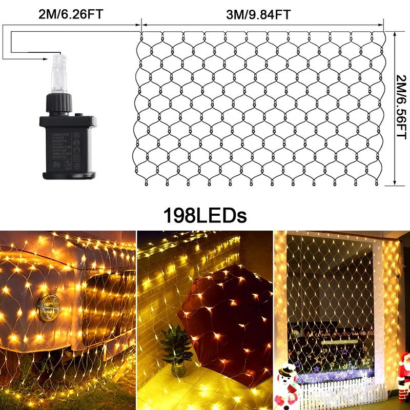 WoskjXas Light Net Outdoor Net, 198 LEDs, 2 x 3 m Decoration Lighting, 8 Modes Christmas Decoration Light Net, Waterproof Fairy Lights for Garden, Courtyard, Balcony, Pathway