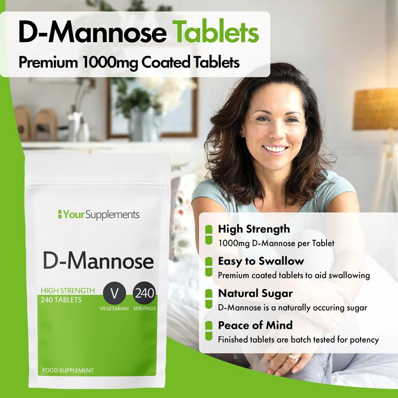 - CONVENIENT SOURCE OF D-MANNOSE - D-Mannose is a naturally occurring sugar found in many fruits, including cranberries. Our high strength tablets are tested to contain a minimum of 1000mg of D-Mannose each.