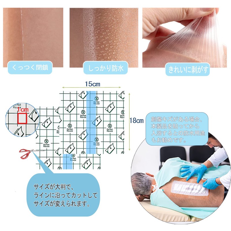 - 【用途が広い】傷に防水できるので、擦り傷や、切り傷などの傷にも、手術された傷にも適用で、水仕事や入浴などの水にかかる活動に活躍しています。透析ポート、胸部カテーテル、人工肛門創傷部位、PICCライン、化学療法ポート、栄養チューブ、腹膜透析、Gチューブ、乳房切除、医療チューブを持つあらゆる患者のシャワー保護に毎日使用できる使い捨て水分バリアーです。