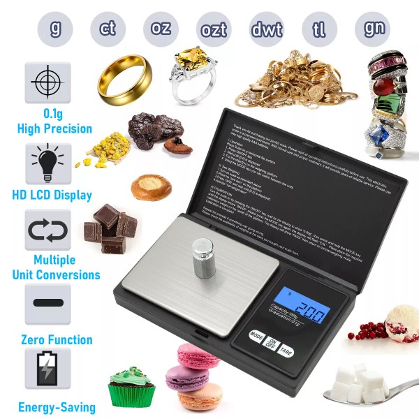 8.Weighing modes: g/oz/gn/ct/ozt/dwt/tl;