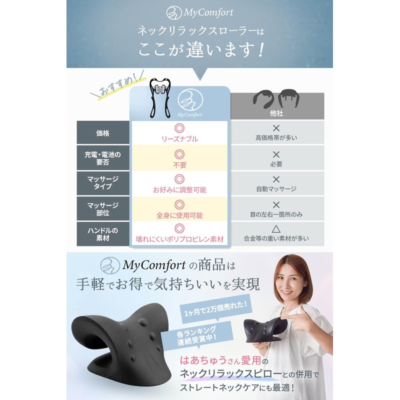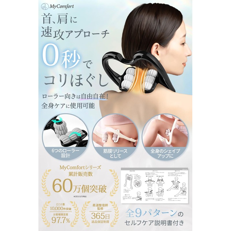 - ✅【柔道整復師が推奨】身体ケアのスペシャリストである柔道整復師に監修を頂き、6つのローラーと自由自在に回転するアプローチ方法で整体師の指圧を再現することに成功。人間工学を基に算出したローラーポイントがどんな方でも首に当てた瞬間に首の伸びを感じられます。筋膜リリース、トリガーポイントセラピー、深部組織のツボ押しに最適です。販売開始わずか2年足らずで累計販売個数60万個突破し、メディアや雑誌でも多く取り上げられているMyComfort(マイコンフォート)だからできる、身体ケアを今すぐお試しください。