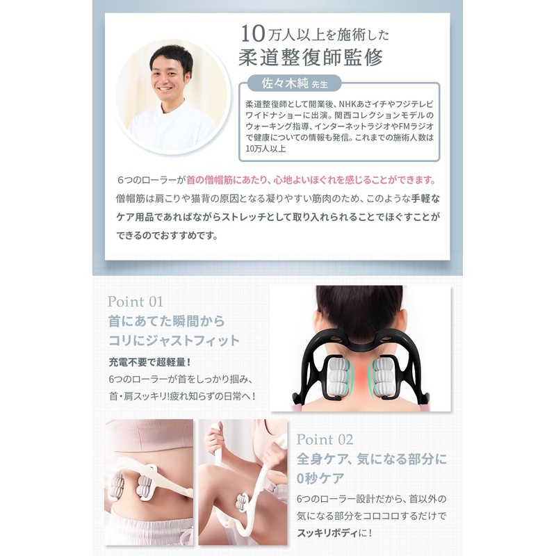 - ✅【6つの自由自在に回転可能なローラー!】ローラーの向きはお好みで調節可能。6つのローラーが身体の芯までほぐします。マッサージ機や整体などでは難しい絶妙な力の調整も自由自在でお好みの強さで首コリのケア、肩こりのケア、ボディケア、シェイプアップが可能です。リサイクル可能な資源で環境にも優しい素材を採用。肌にやさしく、耐久性があり、伸縮性があり、長くお使いいただける商品に仕上げました。