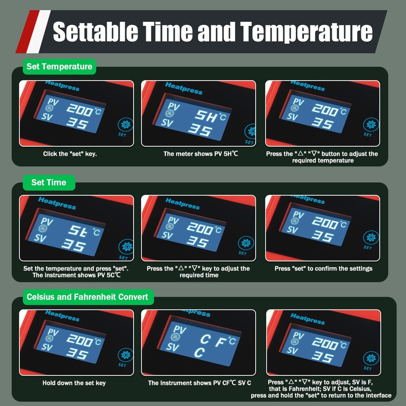 - 【Temperature & Time Control】Equipped with a temperature control system that sets and maintains the desired heating temperature between 0-400°F (±10°F temperature difference). The electronic timer function allows you to set the operating time between 0-999 seconds and automatically sounds a warning at the end of the programme.
