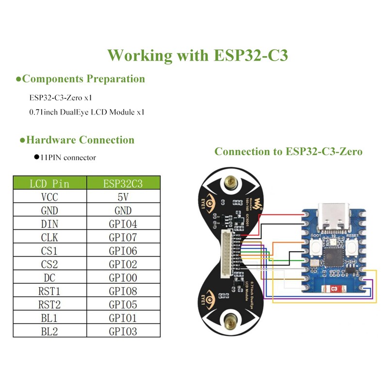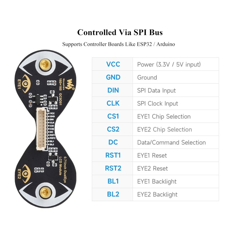 • 0.71inch Double Eye Round LCD Display Module, 160×160 Resolution, SPI Interface, 65K Colors. IPS panel, wide viewing angle