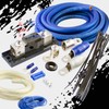0 Gauge AWG 100% OFC Copper Power Amp Amplifier Wiring Install Kit 4000 Watts. It includes: 17’ 1/0 Gauge blue power cable, 3’ 1/0 gauge platinum ground cable, 15’ amp turn on wire, platinum ANL inline fuse holder, platinum ANL fuse, platinum power ring terminal, platinum ground terminal, blue and platinum 1/0 gauge ring terminal with sleeves, (2) 14/16 gauge butt and spade terminals, cable ties, and 1/0 gauge firewall grommet.