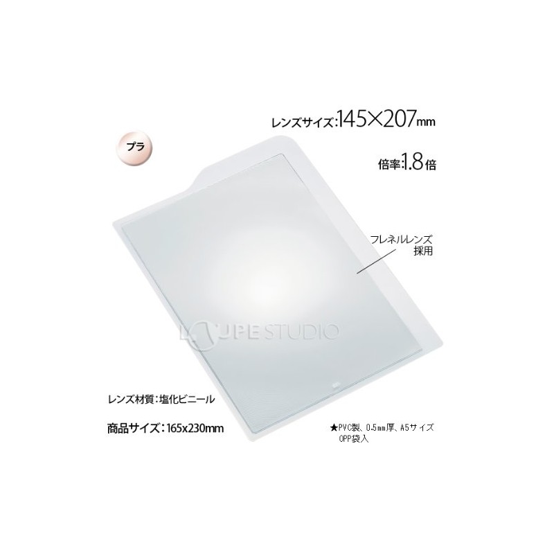 • Product Name: Sheet Lens A5 (comes in pp bag); Model Number: 022; Lens Size: 5.7 x 8.2 inches (145 x 207 mm); Magnification: 1.8 x Weight: 0.7 oz (20 g) (0.5 mm thickness); Product Size: 6.5 x 9.1 inches (165 x 230 mm); Lens Material: Vinyl Chloride
