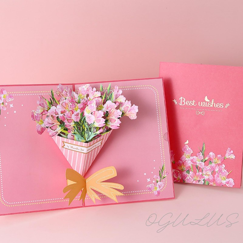 0GULUS Pop-up Card, 3D Greeting Card, Raised 3D, Message Card, Celebration, Birthday, Proposal, Present, Pop-Up Card, Letter (Bouquet Pink)