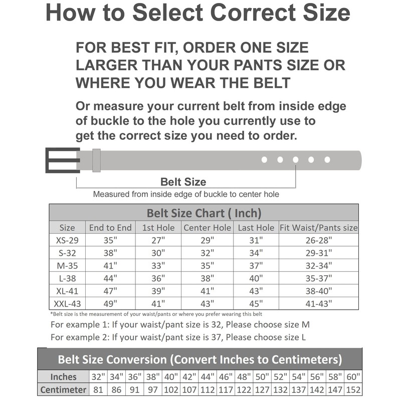 • For proper fit, order the closest size that matches pants size or where you will wear this belt