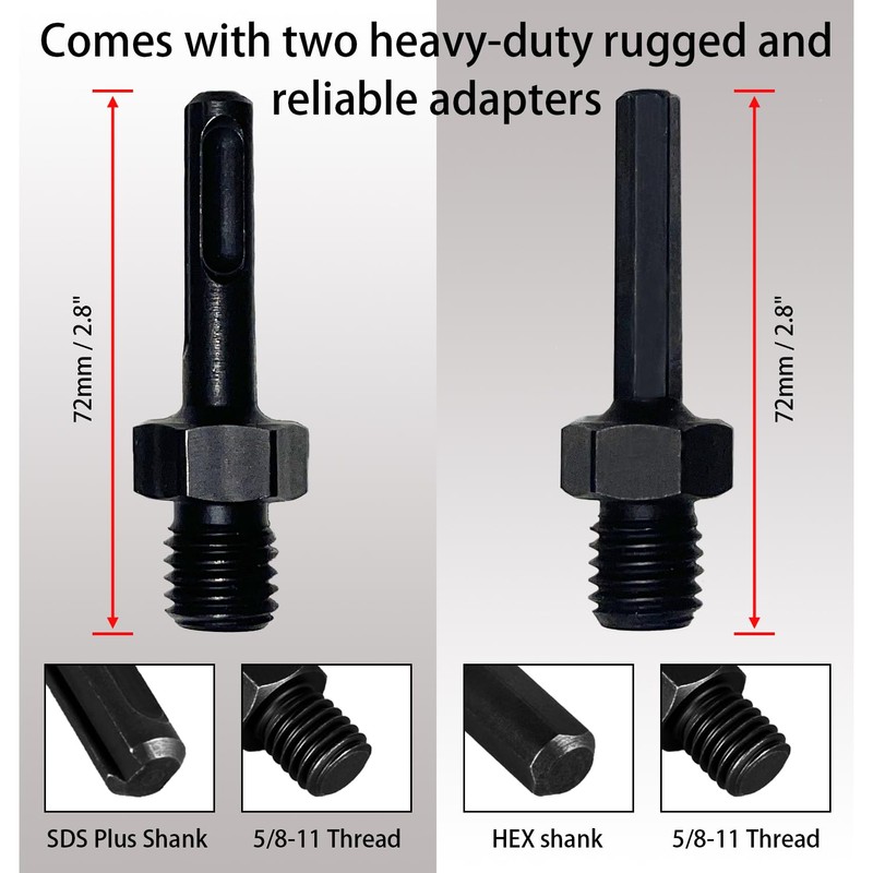 • Versatile Adapters: Equipped with two Adapters - SDS Plus Shank and 3/8inch Hex Shank, providing flexibility and compatibility with different drilling tools comp atibility with a wide range of core drilling machines.